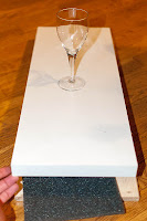 das Weinglas wird mit Doppelkleber in der Mitte des oberen Brettes (welches gern eine lackierte Oberfläche haben darf) fixiert und mit Himbeersaft oder ähnlichen Flüssigkeiten gefüllt. Wein ist zum Einen zu schade und zum Anderen kann man bei Sirup die optimale Farbe durch das Mischverhältnis mit Wasser selbst bestimmen.