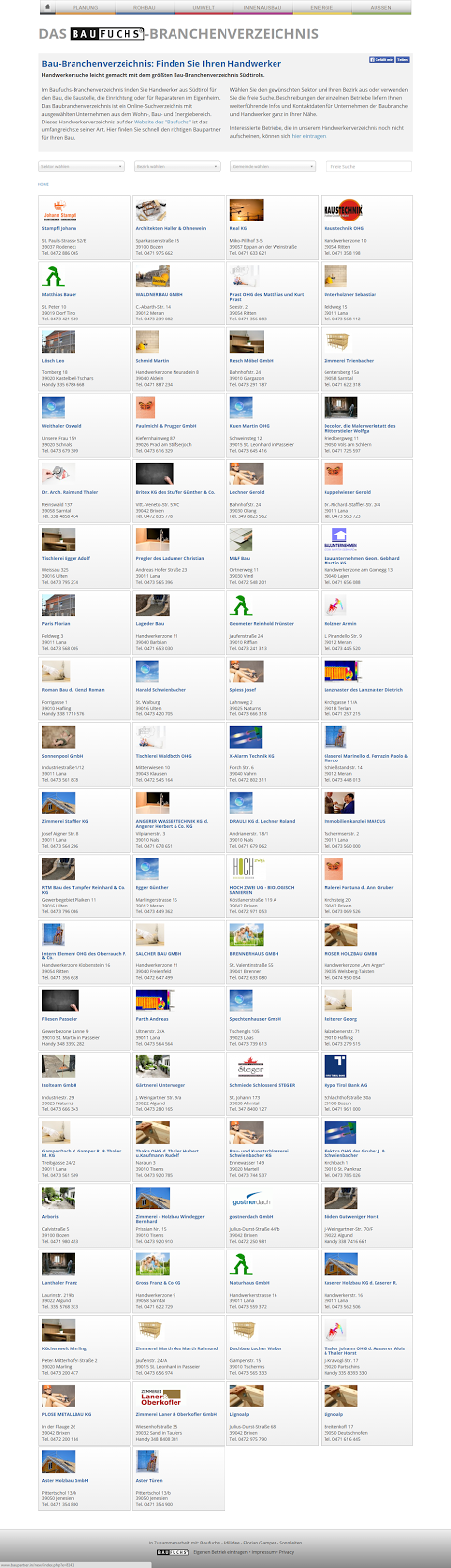 Ein sehr umfangreiches, da seit Jahren gepflegtes Verzeichnis zum Thema Handwerk bzw. Bauhandwerk findet man unter www.baupartner.in - es wurde vor kurzem erneuert und präsentiert die Datensätze nun in einem moderneren und responsiven Design. Interessierte Betriebe haben nun auch die Möglichkeit, ihre Daten selbst einzugeben und somit für eine schnellere Abwicklung zu sorgen. Es können zwar nicht nur Baufuirmen, sondern auch Tischler, Architekten, Einrichtungsprofis oder Wellnessspezialisten gefunden werden. Einfach mal durchklicken und fündig werden.